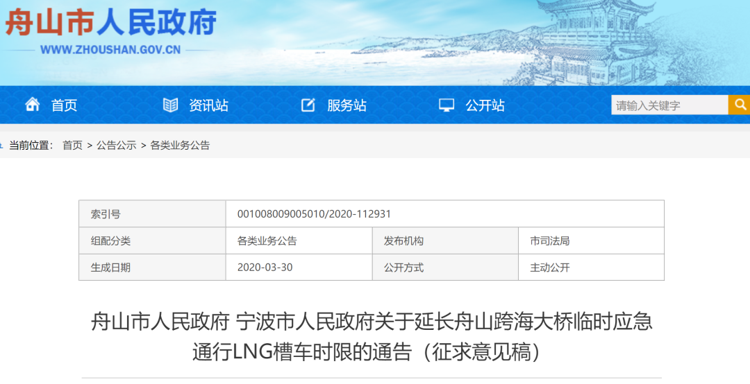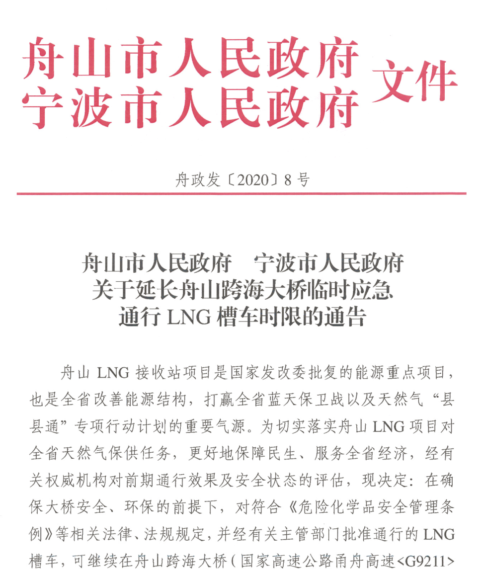 新奥舟山LNG项目拓LNG外运方式:延长大桥应急通行时限,促LNG专渡首航,一期工程配套码头工程通过竣工验收发表时间:2020-04-09 16:31 点击上面蓝字关注我们 新奥舟山LNG项目拓LNG外运方式:延长大桥应急通行时限,促LNG专渡首航,一期工程配套码头工程通过竣工验收 3月30日,舟山市人民政府、宁波市人民政府联合发布《关于延长舟山跨海大桥临时应急通行LNG槽车时限的通告》(舟政发[2020]8号),《通告》明确:在确保大桥安全、环保的前提下,对符合《危险化学品安全管理条例》等相关法律、法规规定,并经有关主管部门批准通行的LNG槽车,可继续在舟山跨海大桥(国家高速公路甬舟高速〈G9211〉段)上临时应急通行,临时应急通行时间为2020年4月1日至2020年12月31日。这比原来批准临时应急通行时限又整整延长了8个月。 新奥能源舟山LNG接收站项目是国家发改委批复的能源重点项目,也是全省改善能源结构,打赢全省蓝天保卫战以及天然气“县县通”专项行动计划的重要气源,为全省天然气保供,更好地保障民生、服务全省经济作出了贡献。“深化新奥能源LNG运输服务”作为省交通运输厅2020年厅领导领衔破解难题之一,牵头领导是任忠副厅长,责任部门是厅公路处。 该项工作从2019年年底就开始谋划,并于2020年1月中旬由任忠副厅长带队赴舟山开展了2020年“三服务”首轮调研,协调、推进LNG运输工作。3月21日,对由交通运输部公路科学研究院编制的《LNG槽车应急通行甬舟高速〈G9211〉运输效果及安全状态评估报告》进行了专家评审,评估结论为:LNG槽车应急通行舟山跨海大桥,风险可控,具备持续通行条件。 下一步,新奥能源舟山LNG接收站主要还是要采用以管道和滚装运输为主、全桥陆路运输为辅的外运方式。此次临时应急通行舟山跨海大桥时限的延长,为下一步实施新奥能源舟山接收站LNG外运综合运输方案迈出了坚实的一步。 相关(一):海上能源“绿色通道”顺利打通 舟山海事开展LNG专渡首航跟船检查 来源:中国水运网 作者:全媒记者 陈俊杰 通讯员 王琦/文 华志波/摄 4月3日上午7时50分,10辆总计装载约200吨液化天然气(LNG)的槽罐车,依次从定海老塘山港作码头驶上LNG专渡“舟渡21”轮,经过大约35分钟的航程抵达金塘西堠滚装码头,随后LNG槽罐车将驶经金塘大桥运往各地。这是该航线开通后的首个LNG专渡航次。 “舟渡21”轮开航前,舟山海事执法人员认真检查了码头消防设施、设备及码头防火、防爆、巡查等安全措施的落实情况,并对该轮消防设备、车辆固定、应急演练、应急器材、船员实操等方面进行了检查。检查中发现该轮存在车辆甲板消防设备设置安放不合规范、车辆停放不当导致应急通道堵塞等缺陷,立即要求该轮船员现场进行了缺陷纠正。随后,海事执法人员随“舟渡21”轮开展了全程跟船检查,为新航线首航保驾护航。 据了解,此次专渡运输的LNG来自新奥能源舟山LNG接收站项目,该项目是华东地区最大的LNG接收及加注项目。由于舟山跨海大桥西堠门大桥段禁止运输危化品,LNG槽罐车无法直接通过跨海大桥出运,此前只能经由海上航线运往宁波后再转运到各地。然而定海鸭蛋山至宁波白峰渡轮航线班次有限,大大限制了新奥能源舟山LNG接收站项目的产能。 “新航线的开通,将极大缓解LNG出运难问题,对保障省内企业顺利复工复产将起到关键作用。”舟山海事局执法人员介绍,此次老塘山滚装码头至金塘西堠码头危化品运输新航线的开通,将与原有的航线形成互补,进一步促进新奥LNG项目产能持续释放,将成为海事监管和服务的重点对象。在该航线打通前,海事部门联合相关单位对通航安全、海洋环境污染风险等多方面开展了系列评估,并多次走访LNG专渡运营公司,要求完善车辆系固手册和相关应急预案的编写工作,做好新航线的风险评估,并落实好各项保障措施。