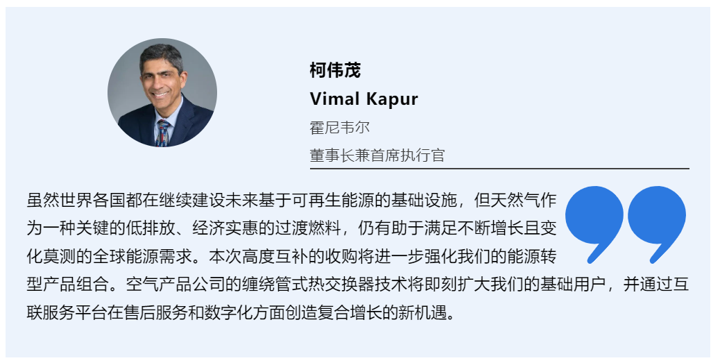 霍尼韦尔和空气产品公司(Air Products)共同宣布,霍尼韦尔已同意以18.1亿美元现金收购空气产品公司的液化天然气(LNG)工艺技术及设备业务。此次收购金额约等于该业务2024年预计税息折旧及摊销前利润(EBITDA)的13倍。 ![]() 交易完成后,霍尼韦尔将能够为客户提供一套综合、高端的解决方案,以助力实现能源转型之旅。这一全新的整体解决方案将涵盖天然气预处理和先进的液化技术,并利用互联服务和Experion®平台的统一数字自动化技术。该全方位的服务解决方案能够实现高效、可靠和优化的天然气资产管理,提供超预期的价值和支持。 ![]() 目前,霍尼韦尔为全球液化天然气客户提供预处理解决方案,与空气产品公司的液化天然气工艺技术和设备业务互为补充,组成了一套完整的产品组合,包含缠绕管式热交换器(CWHE)及相关设备的自主设计和制造。缠绕管式热交换器可在单个交换器中提供最高的天然气吞吐量且占用空间小,在陆上和海上都能实现可靠、稳定和安全运行。 ![]()