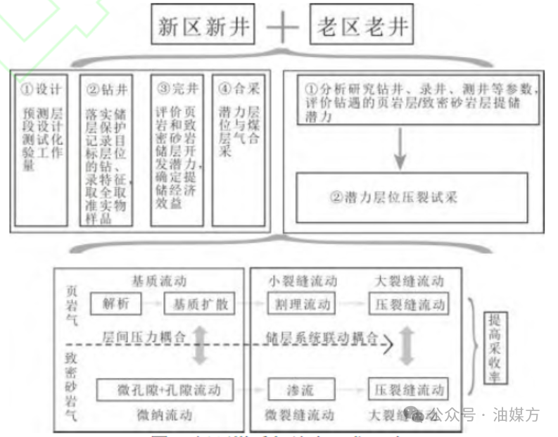 第二步是在在第一步页岩气/致密砂岩气储层特征认识的基础上,开展煤层气、页岩气和致密砂岩气储层同层、临层、同井和临井储层提储动态研究,掌握储层渗流运移规律,实现不同储层合采以提高单井产能,向煤系气合层高效共采方向探索(图5)。