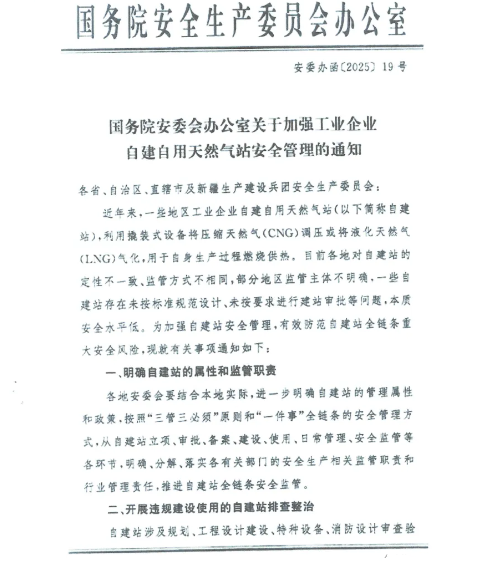 【行业新闻】全文!国务院安委会:关于加强工业企业自建自用天然气站安全管理的通知发表时间:2025-07-11 09:56
